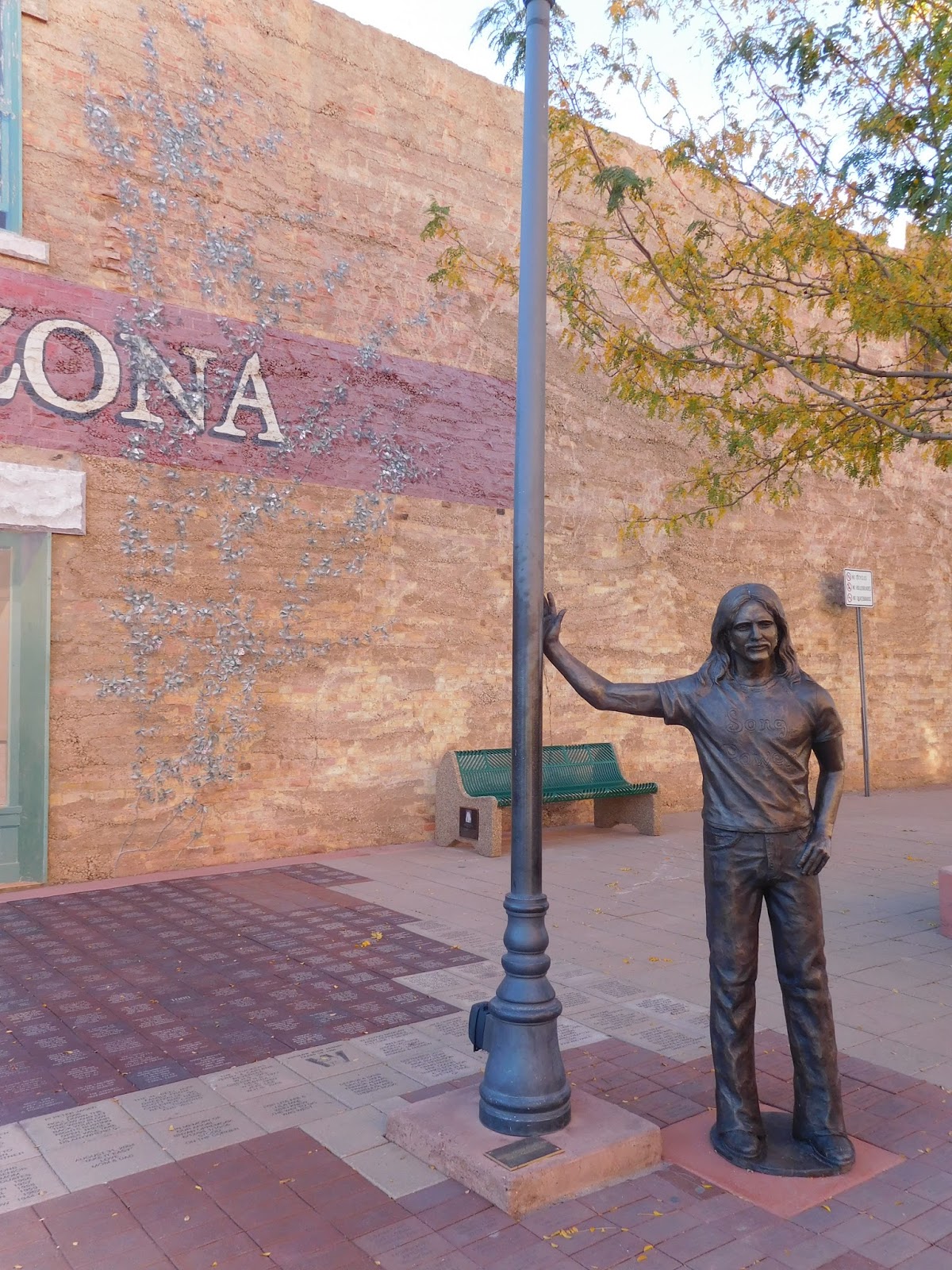 I am standing on the corner in Winslow Arizona! Or, at least I was about an hour ago! Lol! Met up with a WomenRV forum friend here tonight and she bought me dinner. Thanks Liz! We did some photos at the "corner". They even have a red flat bed truck parked there!